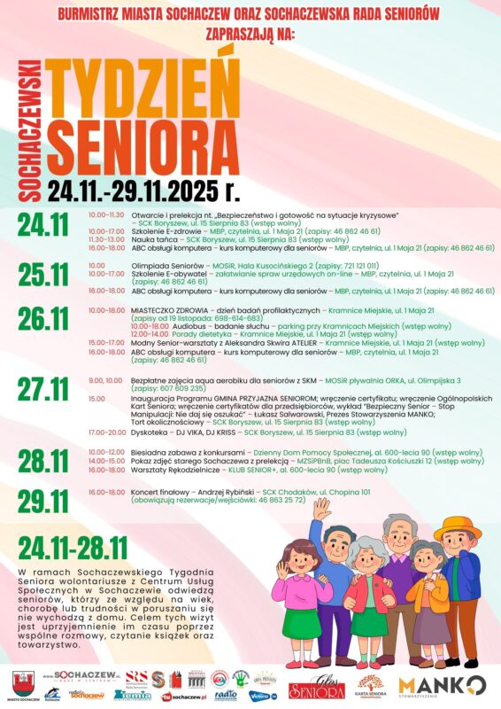 Od 24 do 29 listopada trwać będzie II Sochaczewski Tydzień Seniora. W ramach wydarzenia przygotowano dla mieszkańców-seniorów bogaty program spotkań kulturalnych, społecznych oraz prozdrowotnych. Pierwsze spotkanie zaplanowane na 24 listopada w godz. 10:00–11:30 w Sochaczewskim Centrum Kultury.