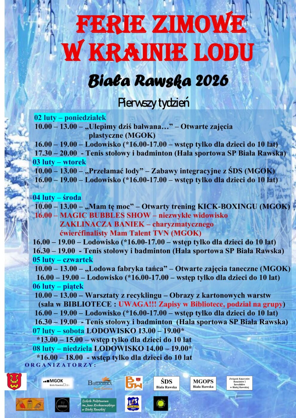 Rozpoczęły się ferie zimowe. W Białej Rawskiej odbywają się one pod hasłem Ferie Zimowe w Krainie Lodu. Dzieci i młodzież mogą korzystać zajęć przygotowanych nie tylko przez Miejsko – Gminny Ośrodek Kultury.