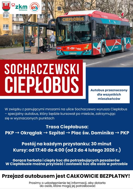 W Sochaczewie uruchomiono Ciepłobus autobus przeznaczony dla osób, które w czasie silnych mrozów potrzebują schronienia i możliwości ogrzania się. To forma wsparcia skierowana przede wszystkim do mieszkańców najbardziej narażonych na skutki niskich temperatur. Więcej na ten temat wie nasza reporterka Klaudia Dzięgielewska.