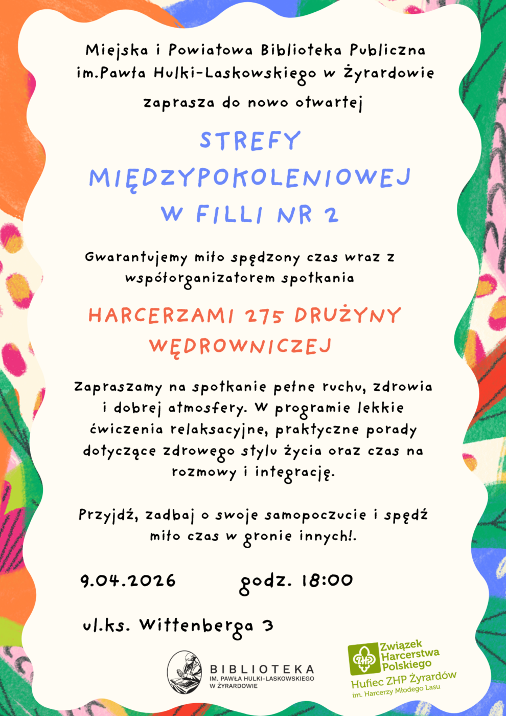W Miejskiej i Powiatowej Bibliotece Publicznej w Żyrardowie Filia nr 2 odbędzie się dziś spotkanie w ramach Strefy Międzypokoleniowej. Wydarzenie skierowane jest do mieszkańców w każdym wieku i stanowi okazję do integracji oraz wspólnego spędzenia czasu. Spotkanie rozpocznie się o godzinie 18:00. Wstęp na wydarzenie jest bezpłatny.