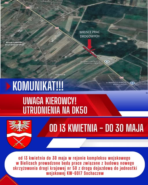 Od 13 kwietnia do 30 maja w pobliżu kompleksu wojskowego na DK nr 50 w rejonie Bielic prowadzone będą prace drogowe związane z budową nowego skrzyżowania. Dodatkowo w tym samym czasie odbywać się będą ćwiczenia wojskowe EUROPE DEFENDER-26. Więcej na ten temat wie nasza reporterka Klaudia Dzięgielewska.